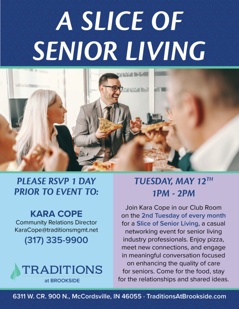 Join Kara Cope in our Club Room on the 2nd Tuesday of every month for a Slice of Senior Living, a casual networking event for senior living industry professionals. Enjoy pizza, meet new connections, and engage in meaningful conversations focused on enhancing the quality of care for seniors. Come for the food, stay for the relationships and shared ideas.