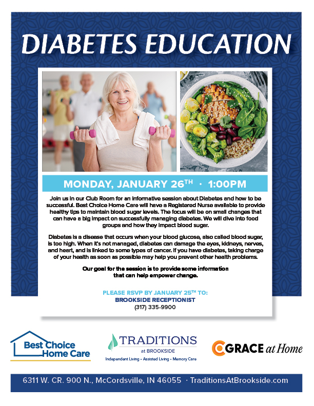 Join us in our Club Room for an informative session about Diabetes and how to be successful. Best Choice Home Care will have a Registered Nurse available to provide healthy tips to maintain blood sugar levels. The focus will be on small changes that can have a big impact on successfully managing diabetes. We will dive into food groups and how they impact blood sugar.