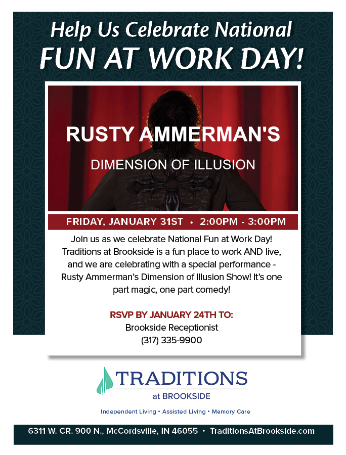 Join us as we celebrate National Fun at Work Day! Traditions at Brookside is a fun place to work AND live, and we are celebrating with a special performance - Rusty Ammerman’s Dimension of Illusion Show! It’s one part magic, one part comedy!